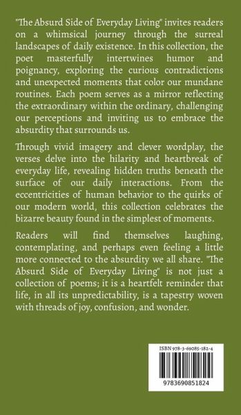 "The Absurd Side of Everyday Living" invites readers on a whimsical journey through the surreal landscapes of daily existence. In this collection, the poet masterfully intertwines humor and poignancy, exploring the curious contradictions and unexpected moments that color our mundane routines. Each poem serves as a mirror reflecting the extraordinary within the ordinary, challenging our perceptions and inviting us to embrace the absurdity that surrounds us. Through vivid imagery and clever wordplay, the verses delve into the hilarity and heartbreak of everyday life, revealing hidden truths beneath the surface of our daily interactions. From the eccentricities of human behavior to the quirks of our modern world, this collection celebrates the bizarre beauty found in the simplest of moments. Readers will find themselves laughing, contemplating, and perhaps even feeling a little more connected to the absurdity we all share. "The Absurd Side of Everyday Living" is not just a collection of poems; it is a heartfelt reminder that life, in all its unpredictability, is a tapestry woven with threads of joy, confusion, and wonder.