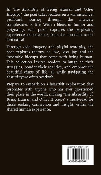 In "The Absurdity of Being Human and Other Hiccups," the poet takes readers on a whimsical yet profound journey through the intricate complexities of life. With a blend of humor and poignancy, each poem captures the perplexing experiences of existence, from the mundane to the fantastical. Through vivid imagery and playful wordplay, the poet explores themes of love, loss, joy, and the inevitable hiccups that come with being human. This collection invites readers to laugh at their struggles, ponder their realities, and embrace the beautiful chaos of life, all while navigating the absurdity we often overlook. Prepare to embark on a heartfelt exploration that resonates with anyone who has ever questioned their place in the world, making "The Absurdity of Being Human and Other Hiccups" a must-read for those seeking connection and insight within the shared human experience.