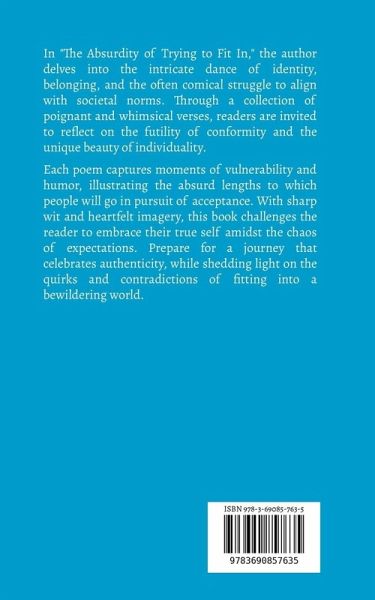 In "The Absurdity of Trying to Fit In," the author delves into the intricate dance of identity, belonging, and the often comical struggle to align with societal norms. Through a collection of poignant and whimsical verses, readers are invited to reflect on the futility of conformity and the unique beauty of individuality. Each poem captures moments of vulnerability and humor, illustrating the absurd lengths to which people will go in pursuit of acceptance. With sharp wit and heartfelt imagery, this book challenges the reader to embrace their true self amidst the chaos of expectations. Prepare for a journey that celebrates authenticity, while shedding light on the quirks and contradictions of fitting into a bewildering world.