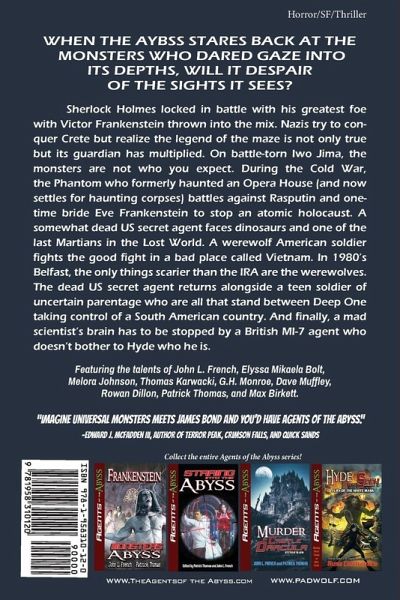 When the Aybss stares back at the monsters who dared gaze into its depths, will it despair of the sights it sees? Sherlock Holmes locked in battle with his greatest foe with Victor Frankenstein thrown into the mix. Nazis try to conquer Crete but realize the legend of the maze is not only true but its guardian has multiplied. On battle-torn Iwo Jima, the monsters are not who you expect. During the Cold War, the Phantom who formerly haunted an Opera House (and now settles for haunting corpses) battles against Rasputin and one-time bride Eve Frankenstein to stop an atomic holocaust. A somewhat dead US secret agent faces dinosaurs and one of the last Martians in the Lost World. A werewolf American soldier fights the good fight in a bad place called Vietnam. In 1980's Belfast, the only things scarier than the IRA are the werewolves. The dead US secret agent returns alongside a teen soldier of uncertain parentage who are all that stand between Deep One taking control of a South American country. And finally, a mad scientist's brain has to be stopped by a British MI-7 agent who doesn't bother to Hyde who he is. Featuring the talents of John L. French, Elyssa Mikaela Bolt, Melora Johnson, Thomas Karwacki, G.H. Monroe, Dave Muffley, Rowan Dillon, Patrick Thomas, and Max Birkett.