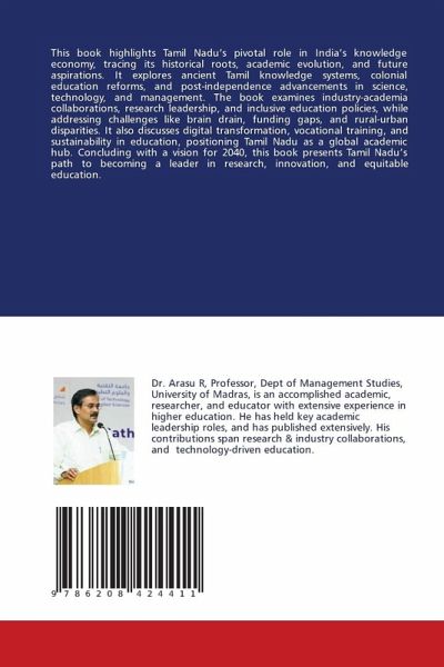 This book highlights Tamil Nadu's pivotal role in India's knowledge economy, tracing its historical roots, academic evolution, and future aspirations. It explores ancient Tamil knowledge systems, colonial education reforms, and post-independence advancements in science, technology, and management. The book examines industry-academia collaborations, research leadership, and inclusive education policies, while addressing challenges like brain drain, funding gaps, and rural-urban disparities. It also discusses digital transformation, vocational training, and sustainability in education, positioning Tamil Nadu as a global academic hub. Concluding with a vision for 2040, this book presents Tamil Nadu's path to becoming a leader in research, innovation, and equitable education.