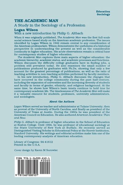 When it was originally published, The Academic Man was the first full-scale social science-based study on the American academic profession. The issues identified by Logan Wilson in 1942 remain central to any consideration of the American professoriate. Wilson demonstrates the usefulness of a historical perspective in understanding the present, as well as the considerable continuity in higher education. His acute observations remain a critical base for contemporary studies of higher education. The Academic Man explores three mam aspects of higher education: the academic hierarchy, academic status, and academic processes and functions. He discusses the difficulty college graduates have in finding jobs, a problem still prevalent today. He also examines the small number of publications produced by graduates with Ph.Ds, showing that only a few account for the greatest percentage of publications, as well as the ratio of teaching activities to non-teaching activities performed by faculty members. In his new introduction, Philip G. Altbach discusses the changes that have occurred in the college community during the past half-century, including the expansion of universities and the increasing diversity of students and faculty hi terms of gender, ethnicity, and religious background. At the same tune, he shows how Wilson's basic tenets continue to hold true for contemporary academic life. The timelessness of The Academic Man will make it a valuable resource for students, professors, university administrators, and sociologists.