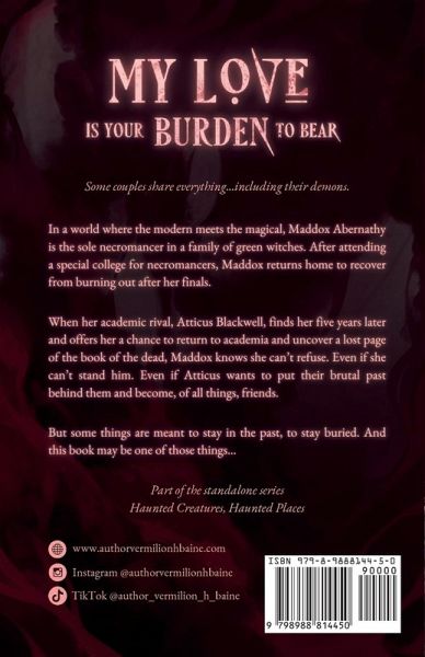 "You were kind to a man who has known little kindness in his life, and now his affection is your burden to bear." -Atticus Blackwell A standalone paranormal romance, The Academy of the Dead contains plenty of gothic and heartbreaking confessions of unrequited love. Full Blurb: Some couples share everything...even their demons. In a world where the modern meets the magical, Maddox Abernathy is the sole necromancer in a family of green witches. After attending a special college for necromancers run by the Commission of Magic Management, she returns home to recover from burning out after her finals. When her academic rival, Atticus Blackwell, finds her five years later and offers her a chance to return to academia and uncover a lost page of the book of the dead, Maddox knows she can't refuse. Even if she can't stand him. Even if Atticus wants to put their brutal past behind them and become, of all things, friends. But some things are meant to stay in the past, to stay buried. And this book may be one of those things... The Academy of the Dead is a gothic romance with forced proximity, duels that turn spicy, and mutual obsession. Perfect for fans of Jane Eyre, The Phantom of the Opera, and Lisa Frankenstein. This is the second book in a series of standalone fantasy and paranormal romances, Haunted Creatures, Haunted Places. Each book features new characters and a new plot, but their stories exist in the same world and around the same time.
