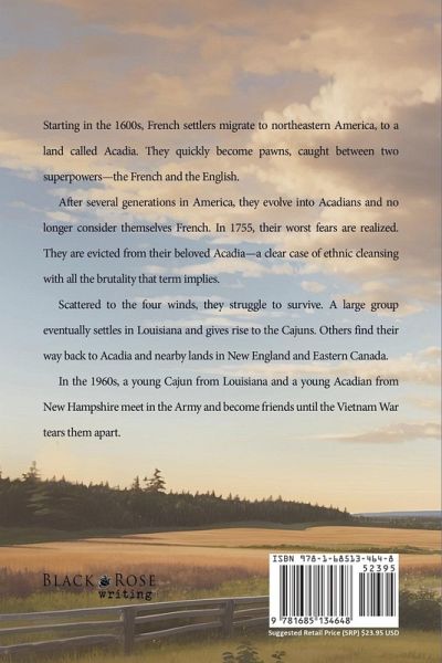 Starting in the 1600s, French settlers migrate to northeastern America, to a land called Acadia. They quickly become pawns, caught between two superpowers-the French and the English. After several generations in America, they evolve into Acadians and no longer consider themselves French. In 1755, their worst fears are realized. They are evicted from their beloved Acadia-a clear case of ethnic cleansing with all the brutality that term implies. Scattered to the four winds, they struggle to survive. A large group eventually settles in Louisiana and gives rise to the Cajuns. Others find their way back to Acadia and nearby lands in New England and Eastern Canada. In the 1960s, a young Cajun from Louisiana and a young Acadian from New Hampshire meet in the Army and become friends until the Vietnam War tears them apart.