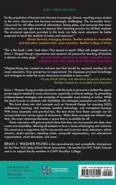 Brian J. Wagner-Yeung provides teachers with the tools to give every student the appropriate support needed in music classrooms, especially in diverse settings, by presenting evidence-based strategies and examples of accessible music-making in action. While the book focuses on students with disabilities, the strategies presented can benefit all. This book dives into vital concepts such as Universal Design for Learning (UDL), multisensory learning, task analysis, assistive technology, and conceptual learning. With many examples and practical tips, this text shows how these concepts can be incorporated into various types of classrooms. When these concepts are utilized regularly, the music classroom becomes a space that is accessible for all. Music educators will gain practical ideas that they can incorporate into their classrooms and ensembles, allowing all students to have a sense of belonging and welcome. This resource is a supportive aid for pre-service and in-service music educators, administrators, studio teachers, teaching artists, non-profit organizations, arts educational organizations, music therapists, and more.