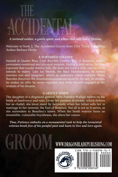 A tortured soldier, a gentle spirit, and a love that will last a lifetime. Welcome to book 2, The Accidental Groom from USA Today Bestselling Author Barbara Devlin A TORTURED SOLDIER Injured at Quatre Bras, Lord Rawden Durant, Earl of Beaulieu, suffers permanent emotional and physical wounds. Hiding a dark secret, he fears exposure that would destroy him. He does not want a wife, and he never intends to marry. Like his friends, the Mad Matchmakers, he battles enemies real and imagined, which an unknown villain exploits. When Rawden discovers the dreadful circumstances faced by the lady he desires, he makes an offer he never expected and finds himself engaged to the woman of his dreams. A GENTLE SPIRIT The daughter of a disgraced general, Miss Patience Wallace teeters on the brink of insolvency and ruin. Given her position in society, which defines her as chattel, she must stand by helplessly when her father sells her in marriage to her nemesis, the Earl of Beaulieu. But all is not as it seems, as she surrenders to Beaulieu's kisses. When the brash warrior bares an irresistible, vulnerable boyishness, she alters her course. Thus, Patience embarks on a monumental task to help the tormented veteran break free of his painful past and learn to live and love again. The Mad Matchmaking Men of Waterloo is an #ownvoices series The Accidental Duke The Accidental Groom The Accidental Hero