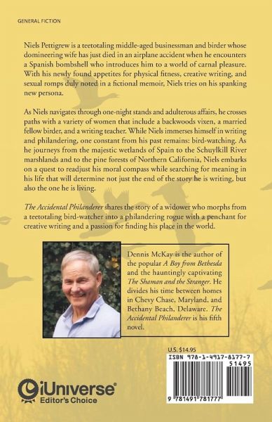 Niels Pettigrew is a teetotaling middle-aged businessman and birder whose domineering wife has just died in an airplane accident when he encounters a Spanish bombshell who introduces him to a world of carnal pleasure. With his newly found appetites for physical fitness, creative writing, and sexual romps duly noted in a fictional memoir, Niels tries on his spanking new persona. As Niels navigates through one-night stands and adulterous affairs, he crosses paths with a variety of women that include a backwoods vixen, a married fellow birder, and a writing teacher. While Niels immerses himself in writing and philandering, one constant from his past remains: bird-watching. As he journeys from the majestic wetlands of Spain to the Schuylkill River marshlands and to the pine forests of Northern California, Niels embarks on a quest to readjust his moral compass while searching for meaning in his life that will determine not just the end of the story he is writing, but also the one he is living. The Accidental Philanderer shares the story of a widower who morphs from a teetotaling bird-watcher into a philandering rogue with a penchant for creative writing and a passion for finding his place in the world.