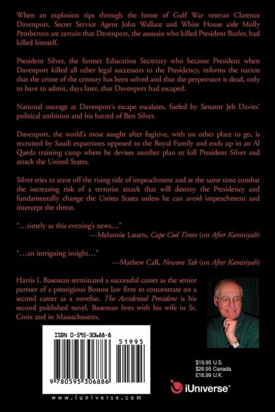 When an explosion rips through the home of Gulf War veteran Clarence Davenport, Secret Service Agent John Wallace and White House aide Molly Pemberton are certain that Davenport, the assassin who killed President Butler, had killed himself. President Silver, the former Education Secretary who became President when Davenport killed all other legal successors to the Presidency, informs the nation that the crime of the century has been solved and that the perpetrator is dead, only to have to admit, days later, that Davenport had escaped. National outrage at Davenport's escape escalates, fueled by Senator Jeb Davies' political ambition and his hatred of Ben Silver. Davenport, the world's most sought after fugitive, with no other place to go, is recruited by Saudi expatriates opposed to the Royal Family and ends up in an Al Qaeda training camp where he devises another plan to kill President Silver and attack the United States. Silver tries to stave off the rising tide of impeachment and at the same time combat the increasing risk of a terrorist attack that will destroy the Presidency and fundamentally change the Unites States unless he can avoid impeachment and intercept the threat. "...timely as this evening's news..." --Melannie Lauers, Cape Cod Times(on After Kamisiyah) "...an intriguing insight..." --Mathew Call, Newton Tab (on After Kamisiyah)
