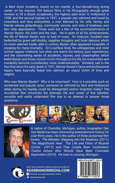 A Best Actor Academy Award on his mantle, a four-decade-long acting career on his resume, 104 feature films in his filmography, enough great reviews to fill a dozen scrapbooks, the highest paid actor in Hollywood in 1938, and the second highest in 1937, a popular star admired and loved by coworkers and fans everywhere, a man beloved by his wife, family, and friends whose philanthropy, community service, and acts of kindness won him wide approbation. Those were but a few of the accomplishments of Warner Baxter, the actor and the man. Yet in spite of all his achievements, the life of Warner Baxter was no bed of roses. An insecure, troubled man bedeviled by grave self-doubts, negative thoughts and inner demons which he never seemed totally able to control, Baxter often appeared incapable of enjoying his many triumphs. On a surface level, his unhappiness and inner turmoil appear irrational, but when one learns his history, past experiences, and the astonishing series of accidents, injuries, and catastrophes which befell Baxter and those closest to him throughout his life, his insecurities and instability become considerably more understandable. Similarly sad is the fact that since his early death in 1951, Warner Baxter's fame and professional legacy have basically faded into oblivion, an unjust victim of time and neglect. Who was Warner Baxter? Why is he important? How is it possible such an acclaimed and popular actor, someone so admired by fans and Hollywood elites during his heyday could be disregarded and/or forgotten today? The Accidental Star chronicles the dramatic life and career of this talented, versatile and vastly underrated film star in an attempt to answer those questions. A native of Charlotte, Michigan, author, biographer Dan Van Neste has been chronicling entertainment history for over thirty years. He is the author of three acclaimed film books: The Whistler: Stepping Into the Shadows (2011), The Magnificent Heel: The Life and Films of Ricardo Cortez (2017), and They Coulda Been Contenders: Twelve Actors Who Should Have Been Cinematic Superstars (2019). He lives in Lansing, Michigan.
