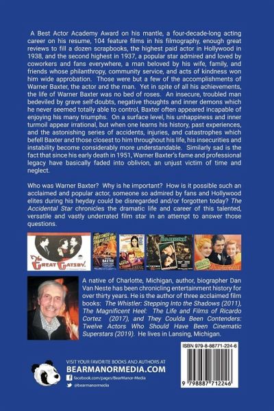 A Best Actor Academy Award on his mantle, a four-decade-long acting career on his resume, 104 feature films in his filmography, enough great reviews to fill a dozen scrapbooks, the highest paid actor in Hollywood in 1938, and the second highest in 1937, a popular star admired and loved by coworkers and fans everywhere, a man beloved by his wife, family, and friends whose philanthropy, community service, and acts of kindness won him wide approbation. Those were but a few of the accomplishments of Warner Baxter, the actor and the man. Yet in spite of all his achievements, the life of Warner Baxter was no bed of roses. An insecure, troubled man bedeviled by grave self-doubts, negative thoughts and inner demons which he never seemed totally able to control, Baxter often appeared incapable of enjoying his many triumphs. On a surface level, his unhappiness and inner turmoil appear irrational, but when one learns his history, past experiences, and the astonishing series of accidents, injuries, and catastrophes which befell Baxter and those closest to him throughout his life, his insecurities and instability become considerably more understandable. Similarly sad is the fact that since his early death in 1951, Warner Baxter's fame and professional legacy have basically faded into oblivion, an unjust victim of time and neglect. Who was Warner Baxter? Why is he important? How is it possible such an acclaimed and popular actor, someone so admired by fans and Hollywood elites during his heyday could be disregarded and/or forgotten today? The Accidental Star chronicles the dramatic life and career of this talented, versatile and vastly underrated film star in an attempt to answer those questions. A native of Charlotte, Michigan, author, biographer Dan Van Neste has been chronicling entertainment history for over thirty years. He is the author of three acclaimed film books: The Whistler: Stepping Into the Shadows (2011), The Magnificent Heel: The Life and Films of Ricardo Cortez (2017), and They Coulda Been Contenders: Twelve Actors Who Should Have Been Cinematic Superstars (2019). He lives in Lansing, Michigan.