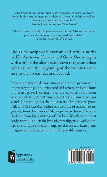 The Accidental Universe and Other Stories begins with a riff on the oldest tale known to man and then takes us from the beginning of the twentieth century up to the present day and beyond. Some are traditional short stories about one person while others vary the point of view and still others are in the form of one-act plays. Individual lives are explored in different venues and at different times, but they all touch on the search for meaning in a chaotic universe. From the religious beliefs of Christopher Columbus to those of modern evangelicals, from the words of Shakespeare to those of Samuel Beckett, from the paintings of Andrew Wyeth to those of Andy Warhol, and in the lives of grave diggers as well as artists, this unique collection of humorous and serious stories will engage the minds, hearts, and imaginations of readers on an unforgettable journey.