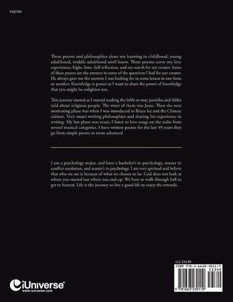 These poems and philosophies share my learning in childhood, young adulthood, middle adulthood until know. These poems cover my love experiences, highs, lows. Self-reflection, and my search for my creator. Some of these poems are the answers to some of the questions I had for our creator. He always gave me the answers I was looking for in some lesson in one form or another. Knowledge is power so I want to share the power of knowledge that you might be enlighten too. This journey started as I started reading the bible so may parables and fables told about religious people. The wiser of them was Jesus. Then the next motivating phase was when I was introduced to Bruce lee and the Chinese culture. Very smart writing philosophies and sharing his experience in writing. My last phase was music I listen to love songs on the radio from several musical categories. I have written poems for the last 49 years they go from simple poems to more advanced