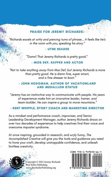 For fans of Steven Pressfield, Elizabeth Gilbert, and Julia Cameron, this international bestseller brings a surprising, irreverent perspective to developing your courage and creativity. Feeling stuck and unsure of yourself? Tired of the constant self-doubt and insecurity holding you back from living your best life? It's time to end that negative self-sabotage and open up a world of limitless creativity and personal growth. Get ready to laugh out loud while you learn the skills and strategies to stop doubting your talents and start exuding confidence. Inside The Accomplished Creative: Overcome Imposter Syndrome, Forge Courage, and Tap Into Limitless Creativity, you'll discover: ¿ why imposter syndrome takes control of your unsuspecting mind (p. 9) ¿ why most personal development books fall short in changing your behavior (p. 25) ¿ significant techniques to create more certainty and clarity (p. 54) ¿ the improvisational way to retrain your brain (p. 75) ¿ which self-care methods work best to balance your mind and prime your creativity (p. 147) ¿ how to separate myth from reality with evidence-backed techniques you can apply today (p. 158) Plus, you'll get practical exercises throughout the book to keep you enthusiastic about the process! Writer Jeremy Richards brings his improvisation and leadership skills to this energetic ride toward positivity and poise. His personal, relatable examples and connections will help you achieve your new, determined mindset. This irreverent, hilarious page-turner is sure to have you feeling accomplished as you step out of the corner and release your creativity into the world. Praise for Jeremy Richards: "Richards excels at witty and piercing turns of phrase ... It feels like he's in the room with you, speaking his story." -- Utne Reader "Damn! That Jeremy Richards is pretty good." -- Mos Def, rapper and actor "Not to take anything away from Mos Def, but J. Richards is more than pretty good. He is damn fine, super smart, and a fine dresser to boot." --John Hodgman, actor and author of Vacationland and Medallion Status "Jeremy has an instinctive way to communicate with people. He years of experience make him an innovative leader, trainer and team-builder. He can inspire a group to move mountains." --Kent Whipple, Story Coach and Marketing Director
