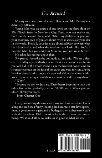 It's easy to accuse those that are different and Max Brauny was definitely different. Young Max was six years old and lived on the third floor on West Tenth Street in New York City. Tony, who was twelve and lived on the second floor, said, "Max, my daddy says you and your momma, each of you are about twice as wide as anyone else in the world. He said, your faces are about halfway between what the Neanderthal and what the modern man looks like. You're a neat kid Max, but you and your Momma, you sure are different." He asked his mother about that. She paused, looked at the boy, nodded, and said, "We are different . . . and by my standards you are the neatest, most beautiful six year old kid in the whole world. I am the heaviest boned and the strongest woman on the face of the earth and you, my son, are the heaviest boned and strongest six year old kid in the whole world. We are special, unique, and there are no others like us anywhere." "Why?" "Because we are, we just are. There hasn't been more than one other like us for probably the last 50,000 years. When you get older I'll tell you more. -From Chapter One I bet you can't top this story with any you have ever read. Come along and see how a funny-looking kid becomes a star-level sportsman, a government agent and a bodyguard on a first-name basis with the president. Did I mention he is also a first-class human being? We should all be so lucky, or so good at what we do.