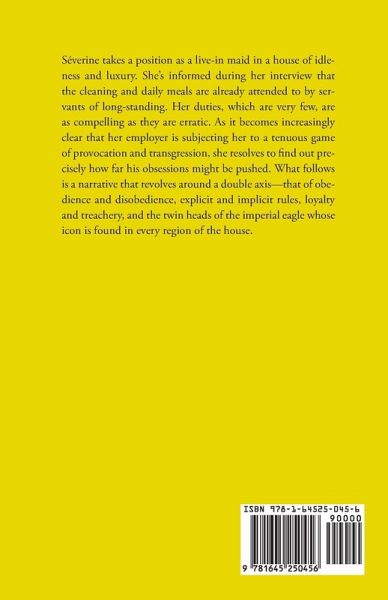 Séverine takes a position as a live-in maid in a house of idleness and luxury. She's informed during her interview that the cleaning and daily meals are already attended to by servants of long-standing. Her duties, which are very few, are as compelling as they are erratic. As it becomes increasingly clear that her employer is subjecting her to a tenuous game of provocation and transgression, she resolves to find out precisely how far his obsessions might be pushed. What follows is a narrative that revolves around a double axis-that of obedience and disobedience, explicit and implicit rules, loyalty and treachery, and the twin heads of the imperial eagle whose icon is found in every region of the house.