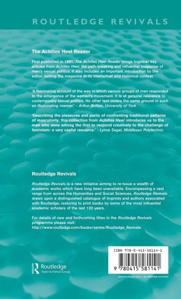 First published in 1991, The Achilles Heel Reader brings together key articles from Achilles Heel, the path-breaking and influential magazine of men's sexual politics. It also includes an important introduction by the editor, setting the magazine in its intellectual and historical context. Achilles Heel, first published in 1978, was a magazine which explored positive conceptions of masculinity and the ways in which men can change in response to the challenge of feminism. It sought to persuade men to take responsibility for the power they share as men in relation to women - and to use this responsibility both in their personal relationships and in challenging the political and social institutions and practices that embody such power. This selection covers crucial issues in men's lives - work, sexuality, children, relationships, family, class, sharing the experience of different masculinities - and brilliantly catches the tensions and anxieties of men trying to cope with the interplay between their sexuality and their political commitments. By bringing the personal and the political together The Achilles Heel Reader reconsiders basic questions of socialist theory and practice. It will be of great value to students of sociology, women's studies, politics and cultural studies, as well as those interested in feminism as part of a process of reworking socialism.