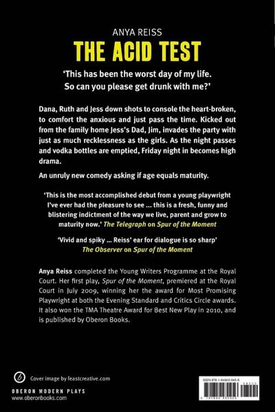 This has been the worst day of my life. So can you please get drunk with me? Dana, Ruth and Jess down shots to console the heart-broken, to comfort the anxious and just pass the time. Kicked out from the family home Jess's dad, Jim, invades the party with just as much recklessness as the girls. As the night passes and vodka bottles are emptied, Friday night in becomes high drama. An unruly new comedy asking if age equals maturity, Acid Test opened at the Royal Court in May 2011.