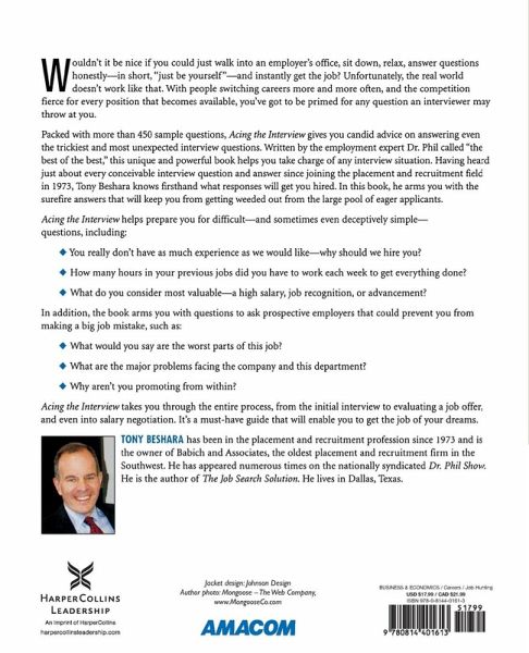 At some point, most people have been caught off guard by tough interview questions. This book helps you take charge of the situation! In Acing the Interview, the employment expert Dr. Phil called "the best of the best" gives job seekers candid advice for answering even the most unexpected questions, including: You really don't have as much experience as we would like?why should we hire you? How many hours in your previous jobs did you have to work each week to get everything done? What do you consider most valuable?a high salary, job recognition, or advancement? The book also arms business professionals with questions to ask prospective employers that could prevent them from making a big job mistake, such as: What would you say are the worst parts of this job? What are the major problems facing the company and this department? Why aren't you promoting from within? Taking you through the entire process, from the initial interview to evaluating a job offer, and even into salary negotiation, Acing the Interview is a no-nonsense, take-no-prisoners guide to interview success.