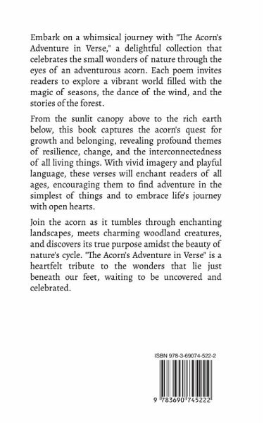 Embark on a whimsical journey with "The Acorn's Adventure in Verse," a delightful collection that celebrates the small wonders of nature through the eyes of an adventurous acorn. Each poem invites readers to explore a vibrant world filled with the magic of seasons, the dance of the wind, and the stories of the forest. From the sunlit canopy above to the rich earth below, this book captures the acorn's quest for growth and belonging, revealing profound themes of resilience, change, and the interconnectedness of all living things. With vivid imagery and playful language, these verses will enchant readers of all ages, encouraging them to find adventure in the simplest of things and to embrace life's journey with open hearts. Join the acorn as it tumbles through enchanting landscapes, meets charming woodland creatures, and discovers its true purpose amidst the beauty of nature's cycle. "The Acorn's Adventure in Verse" is a heartfelt tribute to the wonders that lie just beneath our feet, waiting to be uncovered and celebrated.
