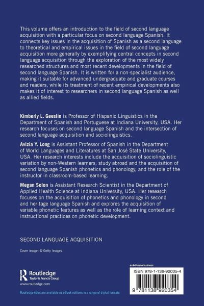 This volume offers an introduction to the field of second language acquisition with a particular focus on second language Spanish. It connects key issues in the acquisition of Spanish as a second language to theoretical and empirical issues in the field of second language acquisition more generally by exemplifying central concepts in second language acquisition through the exploration of the most widely researched structures and most recent developments in the field of second language Spanish. It is written for a non-specialist audience, making it suitable for advanced undergraduate and graduate courses and readers, while its treatment of recent empirical developments also makes it of interest to researchers in second language Spanish as well as allied fields.