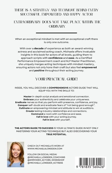 It Is Time... To Unlock Your Acting Potential and Embrace Success! Stop Procrastinating and start moving towards your acting career NOW. This book combines acting techniques with mindset mastery so that you can overcome any limiting beliefs and self-doubts as you embark on a transformative journey towards success. With over a decade of experience as both an award-winning actress and acclaimed acting coach, Michaela offers invaluable insights in this book for actors of all levels, guiding them to approach scripts with confidence and ease. As a certified life coach and NLP Master Practitioner, she uniquely merges acting techniques with mindset mastery, ensuring actors not only hone their craft but also feel empowered and positive throughout their acting journey. Inside, you'll discover the comprehensive actor guide that will equip you with the skills to:Master in-depth script analysis, acting technique and emotional connection. Embrace your authenticity and celebrate your uniqueness. Eradicate nerves so that you perform with presence, confidence, and joy. Conquer self-doubt and eradicate fears of "not being good enough". Cultivate an empowering mindset and attitude to win at auditions. Create lasting industry relationships and connections. Command a room with confidence and ease. Fall in love with your acting journey. The Actor's Guide to Success is your ultimate guide to not only mastering your acting technique but also discovering your true potential.