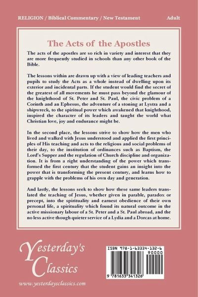The Acts of the Apostles are so rich in variety and interest that they are more frequently studied in schools than any other book of the Bible. This guide leads the reader through the Acts as a whole, showing how the men who lived and walked with Jesus understood and applied the first principles of His teaching and acts to the religious and social problems of their day, while highlighting how these same leaders translated the teaching of Jesus, whether given in parable, paradox or precept, into the spirituality and earnest obedience of their own personal lives, a spirituality which found its natural outcome in the active missionary labour of a St. Peter and a St. Paul abroad, and the no less active though quieter service of a Lydia and a Dorcas at home.