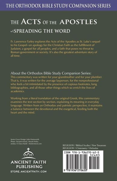 Fr. Lawrence Farley explores the Acts of the Apostles as St. Luke's sequel to his Gospel—an apology for the Christian Faith as the fulfillment of Judaism, a gospel for all peoples, and a faith that poses no threat to Roman government or society. It's also the greatest adventure story of all time. About the Orthodox Bible Study Companion Series: This commentary series was written for the average layperson. Working from a literal translation of the original Greek, the commentary examines the text section by section, explaining its meaning in everyday language. Written from an Orthodox and patristic perspective, it maintains a balance between the devotional and the exegetical, feeding both the heart and the mind.