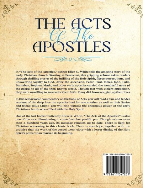 In "The Acts of the Apostles," author Ellen G. White tells the amazing story of the early Christian church. Starting at Pentecost, this gripping volume takes readers through thrilling stories of the infilling of the Holy Spirit, fierce persecutions, and unswerving loyalty to God. After the ascension, Peter, Paul, James, John, Luke, Barnabas, Stephen, Mark, and other early apostles carried the wonderful news of the gospel to all of the then-known world. Though met with violent opposition, they were unwilling to surrender their faith. Many did, however, give up their lives. In this remarkable commentary on the book of Acts, you will read a true and tender account of the deep love the apostles had for one another as well as their Savior and friend Jesus Christ. You will also witness the enormous power of the early Christian church when filled with the Holy Spirit. One of the last books written by Ellen G. White, "The Acts of the Apostles" is also one of the most illuminating to come from her prolific pen. Though written more than a hundred years ago, its message remains up to date. There is light for Christian witnessing in this classic book. There is also hope, together with the promise that the work of the gospel won't close with a lesser display of the Holy Spirit's power than marked its beginning.