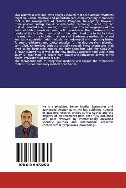 This systemic review and meta-analysis showed that acupuncture treatment might be useful, effective and potentially safe complementary therapeutic tool in the management of Diabetic Peripheral Neuropathy. However, these positive finding should be interpreted cautiously, due to the fact that all included trials have high risks of bias. The heterogeneity of the included trials prevents us making a firm conclusion. The robustness of the results of the included trials could not be determined due to the fact that the majority of the included trials were of 'inadequate methodology' and low study population with multiple methodological and reporting biases. To ensure evidence-based clinical practice, further rigorous sham placebo-controlled, randomized trials are critically needed. These prospective trials need to be large scale studies and fully compliant with the CONSORT, STRICTA statements as well as the new quality assessment tool used in this study (STRICTA-PLUS) to ensure high power and robustness as well as the clinical implications of their results. The therapeutic role of integrative medicine will expand the therapeutic tools of the contemporary medical practitioner.