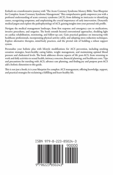 Embark on a transformative journey with "The Acute Coronary Syndrome Mastery Bible: Your Blueprint for Complete Acute Coronary Syndrome Management." This comprehensive guide empowers you with a profound understanding of acute coronary syndrome (ACS), from defining its intricacies to identifying causes, recognizing symptoms, and emphasizing the crucial importance of early intervention. Demystify medical jargon and explore the pathophysiology of ACS, gaining insights into your personal risk profile. Navigate the medical management landscape, from first response and emergency care to medications, invasive procedures, and surgeries. The book extends beyond conventional approaches, shedding light on cardiac rehabilitation, monitoring, and follow-up care. Gain practical guidance on interacting with healthcare professionals, incorporating physical activity safely, and adopting stress reduction techniques. Explore alternative therapies, mind-body practices, and the pivotal role of building a robust support system. Personalize your holistic plan with lifestyle modifications for ACS prevention, including smoking cessation strategies, heart-healthy eating habits, weight management, and maintaining optimal blood pressure and cholesterol levels. The book addresses diverse aspects of life post-ACS, from returning to work and daily activities to sexual health, intimacy concerns, financial planning, and healthcare costs. Tips and precautions for traveling with ACS, advance care planning, and finding joy and purpose post-ACS add a holistic dimension to this guide. This is not just a book; it is your blueprint for complete ACS management, offering knowledge, support, and practical strategies for reclaiming a fulfilling and heart-healthy life.