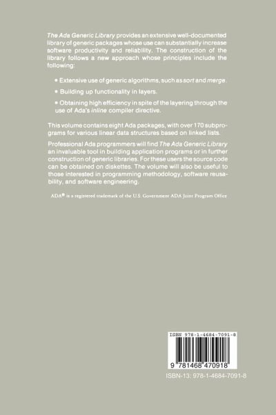 The Ada Generic Library provides an extensive well-documented library of generic packages whose use can substantially increase software productivity and reliability. The construction of the library follows a new approach whose principles include the following: - Extensive use of generic algorithms, such as generic sort and merge. - Building up functionality in layers. - Obtaining high efficiency in spite of the layering through the use of Ada's inline compiler directive. This volume contains eight Ada packages, with over 170 subprograms for various linear data structures based on linked lists. Professional Ada programmers will find The Ada Generic Library an invaluable tool in building application programs or in further construction of generic libraries. For these users the source code can be obtained on diskettes. The volume will also be useful to those interested in programming methodology, software reusability, and software engineering.