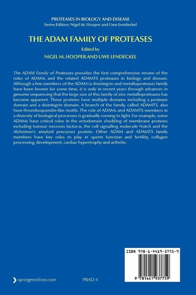The ADAM Family of Proteases provides the first comprehensive review of the roles of ADAMs and the related ADAMTS proteases in biology and disease. Although a few members of the ADAM (a disintegrin and metalloprotease) family have been known for some time, it is only in recent years through advances in genome sequencing that the large size of this family of zinc metalloproteases has become apparent. These proteins have multiple domains including a protease domain and a disintegrin domain. A branch of the family, called ADAMTS, also have thrombospondin-like motifs. The role of ADAMs and ADAMTS members in a diversity of biological processes is gradually coming to light. For example, some ADAMs have critical roles in the ectodomain shedding of membrane proteins including tumour necrosis factor-a, the cell signalling molecule Notch and the Alzheimer's amyloid precursor protein. Other ADAM and ADAMTS family members have key roles to play in sperm function and fertility, collagen processing, development, cardiac hypertrophy and arthritis.