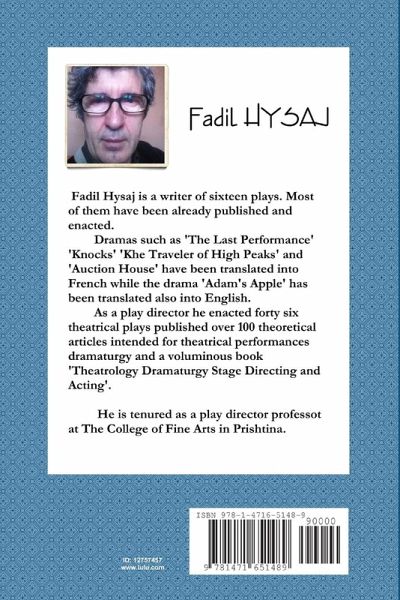 A play of Fadil Hysaj. "The Adam's apple" (A surrealist play)is a play iterensting which rules in a nice way. Fadil Hysaj is a writer of sixteen plays. Most of them have been already published and enacted. Dramas such as 'The Last Performance' 'Knocks' 'Khe Traveler of High Peaks' and 'Auction House' have been translated into French while the drama 'Adam's Apple' has been translated also into English. As a play director he enacted forty six theatrical plays published over 100 theoretical articles intended for theatrical performances dramaturgy and a voluminous book 'Theatrology Dramaturgy Stage Directing and Acting'. He is tenured as a play director professot at The College of Fine Arts in Prishtina.