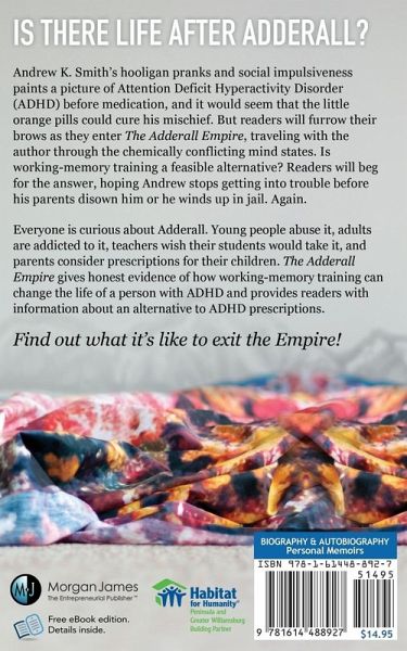 Andrew K. Smith's hooligan pranks and social impulsiveness paints a picture of Attention Deficit Hyperactivity Disorder (ADHD) before medication, and it would seem that the little orange pills could cure his mischief. But readers will furrow their brows as they enter The Adderall Empire, traveling with Andrew K. Smith through the chemically conflicting mind states. Is working-memory training a feasible alternative? Readers will beg for the answer, hoping Andrew stops getting into trouble before his parents disown him or he winds up in jail. Again.