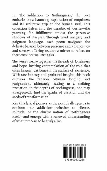 In "The Addiction to Nothingness," the poet embarks on a haunting exploration of emptiness and its seductive grip on the human soul. This collection delves into the paradox of desire-the yearning for fulfillment amidst the pervasive shadows of despair. Through vivid imagery and poignant language, each poem navigates the delicate balance between presence and absence, joy and sorrow, offering readers a mirror to reflect on their own internal struggles. The verses weave together the threads of loneliness and hope, inviting contemplation of the void that often lingers just beneath the surface of existence. With raw honesty and profound insight, this book captures the tension between longing and resignation, ultimately leading to a striking revelation: in the depths of nothingness, one may unexpectedly find the sparks of creation and the seeds of transformation. Join this lyrical journey as the poet challenges us to confront our addictions-whether to silence, solitude, or the elusive notion of nothingness itself-and emerge with a renewed understanding of what it means to be truly alive.