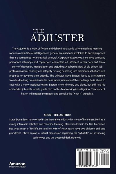 The Adjuster is a work of fiction and delves into a world where machine learning, robotics and artificial intelligence in general are used and exploited to serve purposes that are sometimes not so ethical or moral. Corporate executives, insurance company personnel, attorneys and mysterious characters all intersect in this dark and bleak story Of deception, manipulation and prejudice, A sobering View Of Old school job professionalism, honesty and integrity running headlong into adversaries that are well prepared to advance their agenda. The adjuster, Dave Easton, looks to a retirement from his life-long profession in his near future, unaware of the challenge he is about to face with a newly assigned claim. Easton is world-weary and alone, but still has his embedded job skills to help guide him on this fast-moving investigation. This work Of fiction will engage the reader and provoke the "what if" thoughts.
