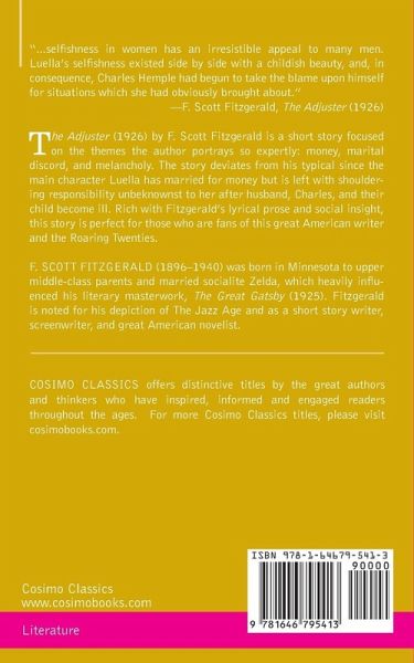 "...selfishness in women has an irresistible appeal to many men. Luella's selfishness existed side by side with a childish beauty, and, in consequence, Charles Hemple had begun to take the blame upon himself for situations which she had obviously brought about." -F. Scott Fitzgerald, The Adjuster (1926) The Adjuster (1926) by F. Scott Fitzgerald is a short story focused on the themes the author portrays so expertly: money, marital discord, and melancholy. The story deviates from his typical since the main character Luella has married for money but is left with shouldering responsibility unbeknownst to her after husband, Charles, and their child become ill. Rich with Fitzgerald's lyrical prose and social insight, this story is perfect for those who are fans of this great American writer and the Roaring Twenties.