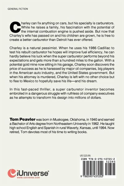 Charley can fix anything on cars, but his specialty is carburetors. While he raises a family, his fascination with the potential of the internal combustion engine is pushed aside. But now that Charley¿s wife has passed on and his children are grown, he is free to create a better carburetor than Detroit has ever offered. Charley is a natural pessimist. When he uses his 1986 Cadillac to test his rebuilt carburetor he hopes will improve fuel efficiency, he can hardly believe his luck when the super carburetor performs beyond his expectations and gets more than a hundred miles to the gallon. With a potential gold mine now sitting in his garage, Charley soon discovers the price of success as he is harassed by major oil companies, big players in the American auto industry, and the United States government. But when his attorney is murdered, Charley is left with no other choice but to flee to Mexico to hopefully save his life¿and his dream. In this fast-paced thriller, a super carburetor inventor becomes embroiled in a dangerous struggle with ruthless oil company executives as he attempts to transform his design into millions of dollars.