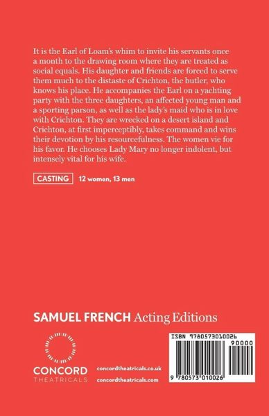 It is the Earl of Loam's whim to invite his servants once a month to the drawing room where they are treated as social equals. His daughter and friends are forced to serve them much to the distaste of Crichton, the butler, who knows his place. He accompanies the Earl on a yachting party with the three daughters, an affected young man and a sporting parson, as well as the lady's maid who is in love with Crichton. They are wrecked on a desert island and Crichton, at first imperceptibly, takes command and wins their devotion by his resourcefulness. The women vie for his favor. He chooses Lady Mary no longer indolent, but intensely vital for his wife.-12 women, 13 men
