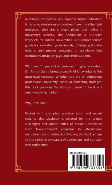 The Admissions & Outreach Playbook for Indian Universities is a definitive guide for education professionals seeking to transform their admissions and outreach strategies. Authored by Dr. Ashish Gupta, a seasoned expert with over 14 years of experience in higher education, this book offers actionable insights, practical tools, and proven frameworks tailored to the unique challenges and opportunities of Indian universities. This comprehensive playbook delves into every aspect of the admissions process-from building a winning team and crafting compelling value propositions to leveraging digital marketing, managing admissions funnels, and fostering relationships with key stakeholders. It also highlights the transformative role of technology, including data analytics, AI, and virtual engagement tools, in driving efficient and impactful admissions. Key topics include: - Designing and executing successful admissions campaigns. - Building trust and engagement with students, parents, and school counselors. - Strategies for addressing low-enrollment programs and competitive markets. Whether you are an admissions professional, university leader, or marketing strategist, this book equips you with the knowledge and strategies needed to attract the right students, build lasting relationships, and ensure institutional growth. The Admissions & Outreach Playbook for Indian Universities is a must-read for anyone passionate about shaping the future of higher education in India.