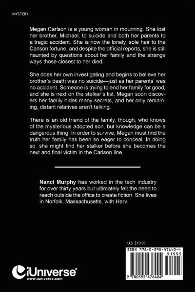 Megan Carlson is a young woman in mourning. She lost her brother, Michael, to suicide and both her parents to a tragic accident. She is now the lonely, sole heir to the Carlson fortune, and despite the official reports, she is still haunted by questions about her family and the strange ways those closest to her died. She does her own investigating and begins to believe her brother¿s death was no suicide¿just as her parents¿ was no accident. Someone is trying to end her family for good, and she is next on the stalker¿s list. Megan soon discovers her family hides many secrets, and her only remaining, distant relatives aren¿t talking. There is an old friend of the family, though, who knows of the mysterious adopted son, but knowledge can be a dangerous thing. In order to survive, Megan must find the truth her family has been so eager to conceal. In doing so, she might find her stalker before she becomes the next and final victim in the Carlson line.