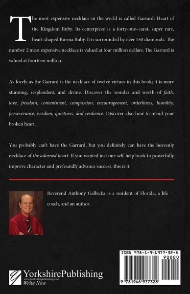 The most expensive necklace in the world is called Garrard: Heart of the Kingdom Ruby. Its centerpiece is a forty-one-carat, super rare, heart-shaped Burma Ruby. It is surrounded by over 150 diamonds. The number 2 most expensive necklace is valued at four million dollars. The Garrard is valued at fourteen million. As lovely as the Garrard is the necklace of twelve virtues in this book; it is more stunning, resplendent, and divine. Discover the wonder and worth of faith, love, freedom, contentment, compassion, encouragement, orderliness, humility, perseverance, wisdom, quietness, and resilience. Discover also how to mend your broken heart. You probably can't have the Garrard, but you definitely can have the heavenly necklace of the adorned heart. If you wanted just one self-help book to powerfully improve character and profoundly advance success, this is it.