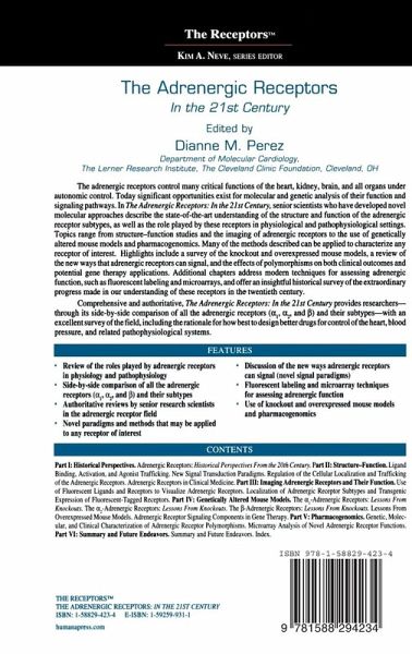 An authoritative review of the current state-of-the-art understanding of the structure and function of the adrenergic receptor subtypes, as well as of the role played by these receptors in physiological and pathophysiological settings. Topics range from structure-function studies and the imaging of adrenergic receptors to the use of genetically altered mouse models and pharmacogenomics. Highlights include a survey of the knockout and overexpressed mouse models, a review of the new ways that adrenergic receptors can signal, and the effects of polymorphisms on clinical outcomes and on potential gene therapy applications. The side-by-side comparison of all the adrenergic receptors (a1, a2, and b) provides the reader with an excellent survey of the field, including the rationale for designing better drugs to control blood pressure and heart function.