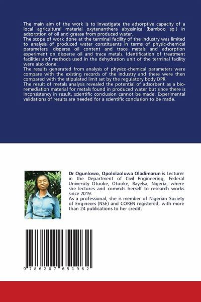 The main aim of the work is to investigate the adsorptive capacity of a local agricultural material oxytenanthera abyssinica (bamboo sp.) in adsorption of oil and grease from produced water.The scope of work done at the terminal facility of the industry was limited to analysis of produced water constituents in terms of physic-chemical parameters, disperse oil content and trace metals and adsorption experiment on disperse oil and trace metals. Identification of treatment facilities and methods used in the dehydration unit of the terminal facility were also done.The results generated from analysis of physico-chemical parameters were compare with the existing records of the industry and these were then compared with the stipulated limit set by the regulatory body DPR.The result of metals analysis revealed the potential of adsorbent as a bio-remediation material for metals found in produced water but since there is inconsistency in result, scientific conclusion cannot be made. Experimental validations of results are needed for a scientific conclusion to be made.