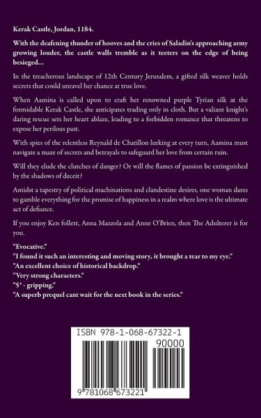 Kerak Castle, Jordan, 1184. With the deafening thunder of hooves and the cries of Saladin's approaching army growing louder, the castle walls tremble as it teeters on the edge of being besieged... In the treacherous landscape of 12th Century Jerusalem, a gifted silk weaver holds secrets that could unravel her chance at true love. When Aamina is called upon to craft her renowned purple Tyrian silk at the formidable Kerak Castle, she anticipates trading only in cloth. But a valiant knight's daring rescue sets her heart ablaze, leading to a forbidden romance that threatens to expose her perilous past. With spies of the relentless Reynald de Chatillon lurking at every turn, Aamina must navigate a maze of secrets and betrayals to safeguard her love from certain ruin. Will they elude the clutches of danger? Or will the flames of passion be extinguished by the shadows of deceit? Amidst a tapestry of political machinations and clandestine desires, one woman dares to gamble everything for the promise of happiness in a realm where love is the ultimate act of defiance. If you enjoy Ken follett, Anna Mazzola and Anne O'Brien, then The Adulterer is for you. "Evocative." "I found it such an interesting and moving story, it brought a tear to my eye." "An excellent choice of historical backdrop." "Very strong characters." "5* - gripping." "A superb prequel cant wait for the next book in the series."