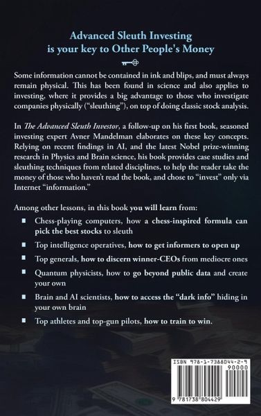 Some information cannot be contained in ink and blips and must always remain physical. This has been found in science, but also applies to investing, where it provides big advantage to investors who investigate companies physically ("sleuthing.") In this book (a follow up on his first), seasoned investing expert Avner Mandelman, relying on recent findings in AI and the latest Nobel Prize winning research, presents case-studies and sleuthing techniques to help the reader take the money of those who haven't read the book. In these studies, written in an engaging style, you will learn from:Chess-playing computers, how a chess-inspired formula picks the best stocks to sleuth Top intel operatives, how to get informers to open up Top Generals, how to discern winner CEOs from mediocre ones Quantum physicists, how to go beyond public data and create your own Brain and AI scientists, how to access the "dark info" inside your own brain Top athletes and top-gun pilots, how to train to win.