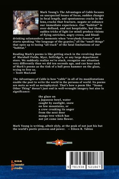 Mark Young's The Advantages of Cable focuses on unexpected losses of focus, sudden changes in focal length, and spontaneous cracks in the lens, cracks that fracture, negate or enhance our immediate experience. Our "habitat" is over-defined, and not hospitable, but these sudden tricks of light (or of mind) produce visions of flying ostriches, angry crows, and blood-drinking salamanders: moments when "everybody freezes" and starts speaking "the language of the gypsies," all the "small things" that open us up to losing "all track" of the fatal limitations of our "habitat." Reading Mark's poems is like getting stuck in the revolving door of Marshall Fields, Myer, Selfridge's, or any large department store. We suddenly realize we're stuck, recognize our situation very differently than we did ten seconds ago, and can hear each of Mark's poems as the tink of a ball peen hammer on the glass, trying to free us. - Scott MacLeod