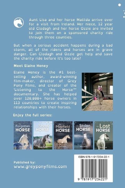 ** This book is a special dyslexia friendly edition. It uses a font called 'Open Dyslexic' designed to make reading easier. It also has more spacing between the lines and contains pages than the standard edition. This edition is printed on cream paper to reduce glare. ** Aunt Lisa and her horse Matilda arrive over for a visit from Ireland. Her niece, 12 year old Clodagh and her horse Ozzie are invited to join them on a sponsored charity ride through three counties. But when a serious accident happens during a bad storm, all of the riders and horses are in grave danger. Can Clodagh and Ozzie get help and save the charity ride before it's too late? Join Clodagh and Ozzie on their next exciting adventure to find out. This wholesome and beautifully told horse story is perfect for horse-crazy kids aged over 8. Written by international horsewoman and award-winning documentary director, Elaine Heney, this is the perfect children's equestrian book for young readers, girls, boys, tweens and teens to curl up with and enjoy. This wholesome horse story follows the success of the first four books in this series - the Forgotten Horse, the Show Horse, the Mayfield Horse and the Stolen Horse.