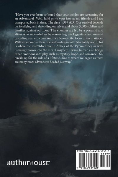 "Have you ever been so bored that your insides are screaming for an Adventure? Well, hold on to your hats as my friends and I are transported back in time. The circa is 599 AD. Our survival depends on fortifying and defending ourselves and about 5,000 soldiers and families against our foes. The enemies are led by a pyramid and aliens who succeeded us by controlling the Egyptians and onward cascading years to come until we become the focus of their attacks. Will we submit to their rule and enslavement? Absolutely not! That is where the real 'Adventure in Attack of the Pyramid' begins with us being thrown into the mix of mayhem. Being human also brings other emotions into play, such as mystery, hope, and romance. So, buckle up for the ride of a lifetime. See to where we began as there are many more adventures headed our way."