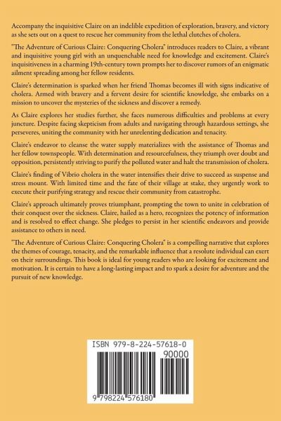 Accompany the inquisitive Claire on an indelible expedition of exploration, bravery, and victory as she sets out on a quest to rescue her community from the lethal clutches of cholera. "The Adventure of Curious Claire: Conquering Cholera" introduces readers to Claire, a vibrant and inquisitive young girl with an unquenchable need for knowledge and excitement. Claire's inquisitiveness in a charming 19th-century town prompts her to discover rumors of an enigmatic ailment spreading among her fellow residents. Claire's determination is sparked when her friend Thomas becomes ill with signs indicative of cholera. Armed with bravery and a fervent desire for scientific knowledge, she embarks on a mission to uncover the mysteries of the sickness and discover a remedy. As Claire explores her studies further, she faces numerous difficulties and problems at every juncture. Despite facing skepticism from adults and navigating through hazardous settings, she perseveres, uniting the community with her unrelenting dedication and tenacity. Claire's endeavor to cleanse the water supply materializes with the assistance of Thomas and her fellow townspeople. With determination and resourcefulness, they triumph over doubt and opposition, persistently striving to purify the polluted water and halt the transmission of cholera. Claire's finding of Vibrio cholera in the water intensifies their drive to succeed as suspense and stress mount. With limited time and the fate of their village at stake, they urgently work to execute their purifying strategy and rescue their community from catastrophe. Claire's approach ultimately proves triumphant, prompting the town to unite in celebration of their conquest over the sickness. Claire, hailed as a hero, recognizes the potency of information and is resolved to effect change. She pledges to persist in her scientific endeavors and provide assistance to others in need. "The Adventure of Curious Claire: Conquering Cholera" is a compelling narrative that explores the themes of courage, tenacity, and the remarkable influence that a resolute individual can exert on their surroundings. This book is ideal for young readers who are looking for excitement and motivation. It is certain to have a long-lasting impact and to spark a desire for adventure and the pursuit of new knowledge.